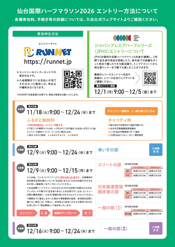 また、ジャパンプレミアハーフシリーズへ加入された方を対象とした、仙台ハーフへ確実に出走したい方のための優先エントリー枠※を設けております。