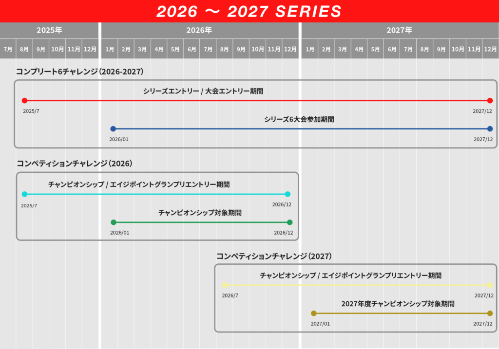 「コンペティションチャレンジ(チャンピオンシップ/エイジポイントグランプリ)」で上位入賞を狙う方、または「コンプリート6チャレンジ」で、確実に6大会完走を目指したい参加者向けの優先出走枠となります。