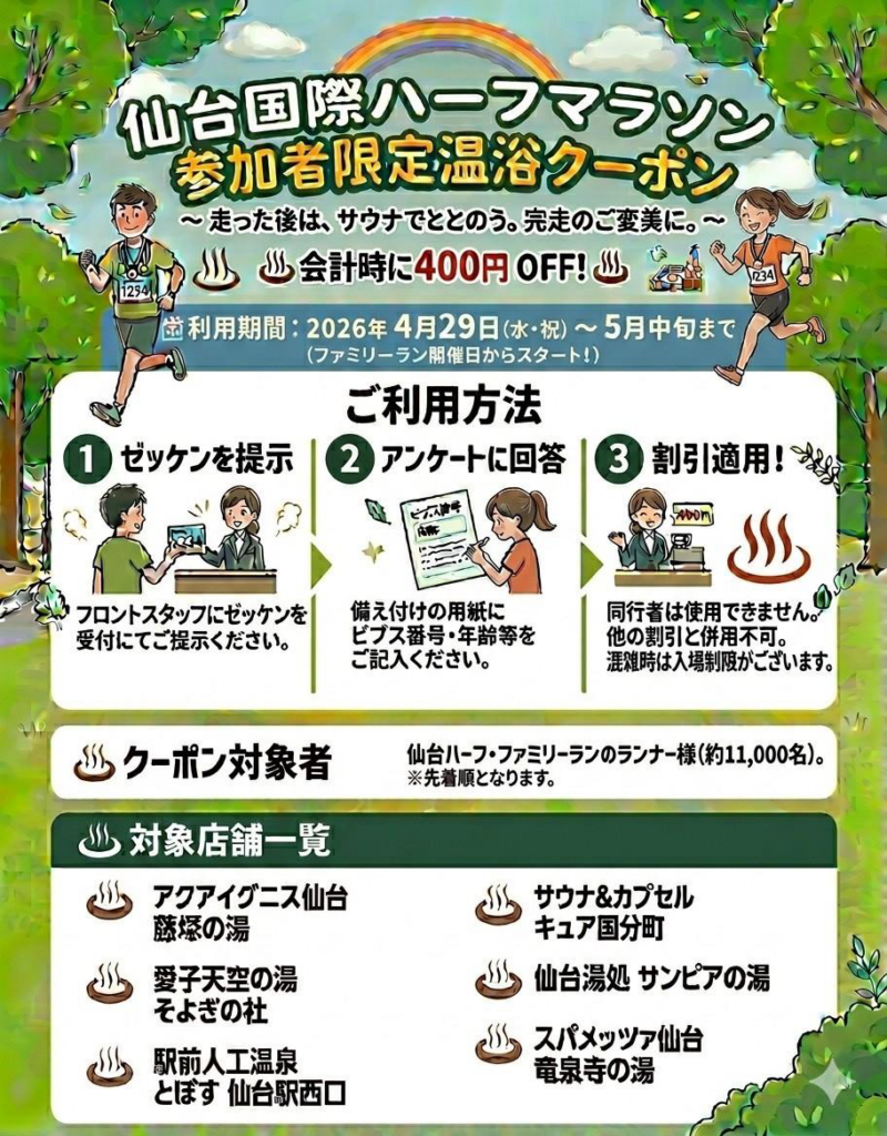 杜の都ランナー応援企画 ビブス提示で温浴400円引き♨