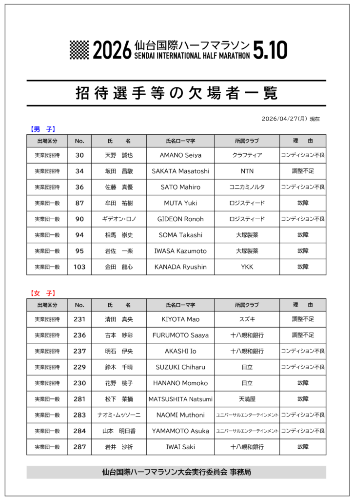 ⇒ 欠場者リスト(04/27)はコチラをご覧ください